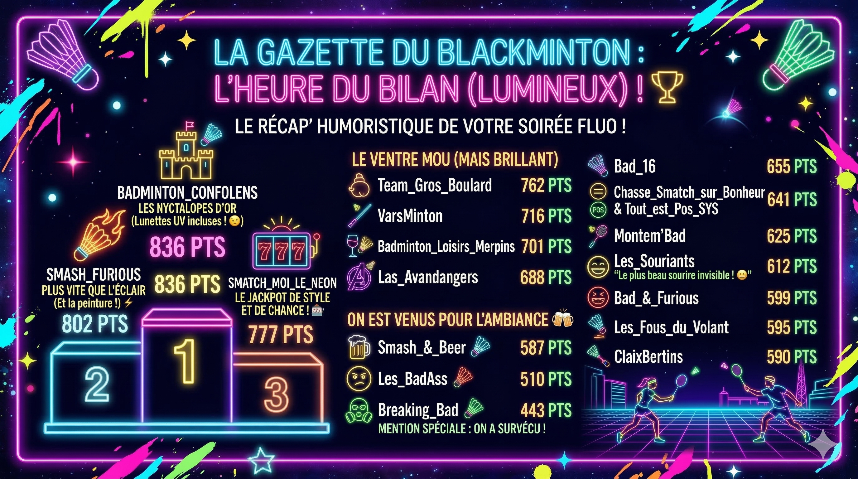 Resultats Blackminton 2026 Lundi 23 mars 2026 - 13:52 Voici les resultats de notre Nuit Blackminton 2026. Photos à venir...