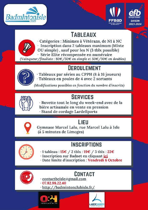 Les inscriptions se feront uniquement sur badnet, par ordre d'arrivée. Le règlement peut se faire directement sur badnet ou par courrier en envoyant le règlement â l'adresse suivante: BCI, Maison des Associations, 16 Avenue de la République, 87170 Isle.